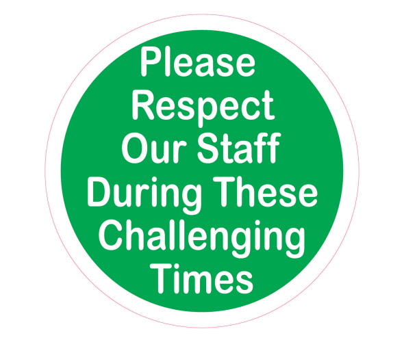 Caution Safety Social Distancing Floor Sticker is printed with 'Please Respect Our Staff During These Challenging Times' design.