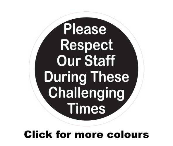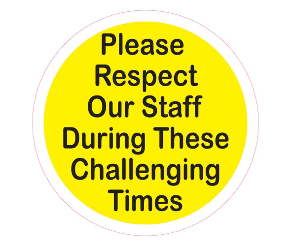 Caution Safety Social Distancing Floor Sticker is printed with 'Please Respect Our Staff During These Challenging Times' design.