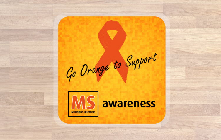 MS Awareness Floor Sticker with text ‘Go Orange to Support, MS Awareness’. This can be brought as seen or you can customise to match your needs.