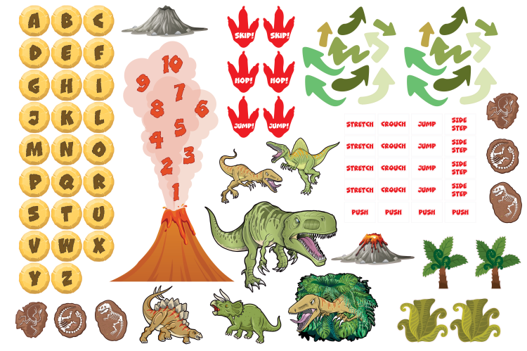 • Supplied as standard with the following sensory elements – 1 x volcano, 26 x alphabet stepping stones (depending on option selected), 1 x large t-rex, 4 x dinosaurs, 1 x hidden dinosaur, 6 x fossils, 18 x arrows, 2 x smaller volcanoes, 2 x palm trees, 2 x bushes, 12 x hop, skip & jump props, 4 x side step props, 4 x push props, 9 x hop, skip & jump dinosaur feet (See diagram images for more info*)