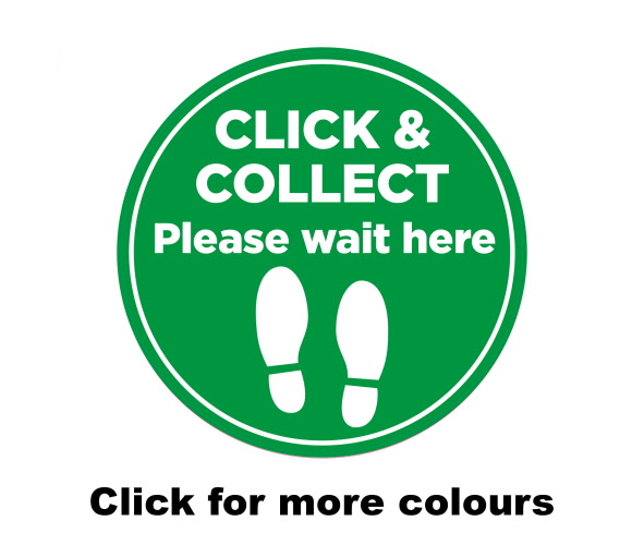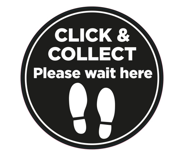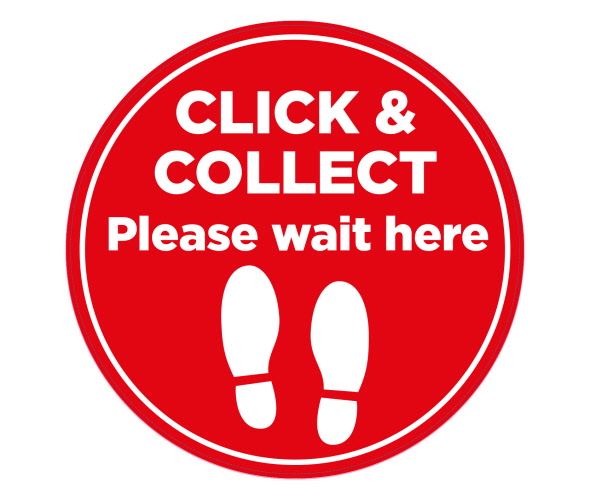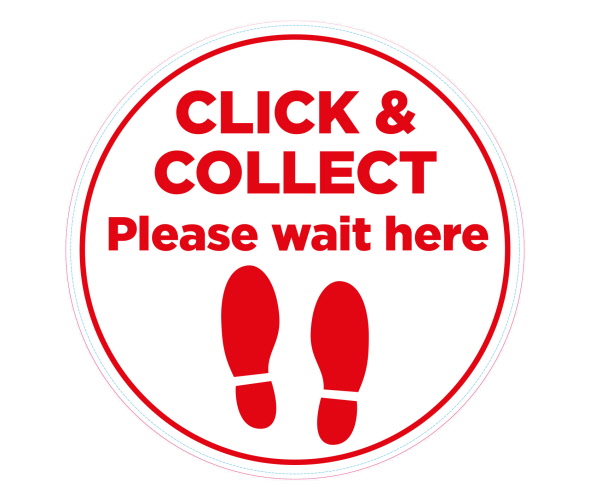 Caution Safety Social Distancing Floor Sticker is printed with 'Click & Collect - Please Wait Here' design.