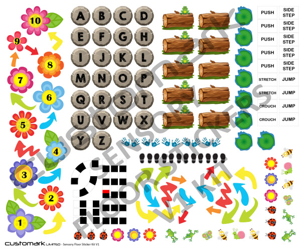 • Supplied as standard with the following sensory elements – 1 to 10 flower garden with arrows, A to Z alphabet stepping stones, 10 x logs, 2 x colourful arrows, 6 x pairs of shoe prints, 5 x pairs of hands, 8 x lily pads, 6 x flowers, 6 x ladybirds, 4 x frogs, 2 x butterflies, 2 x snails, 2 x bumblebees, 1 x striped line kit and 18 x message prompts. (See diagram images for more info*)