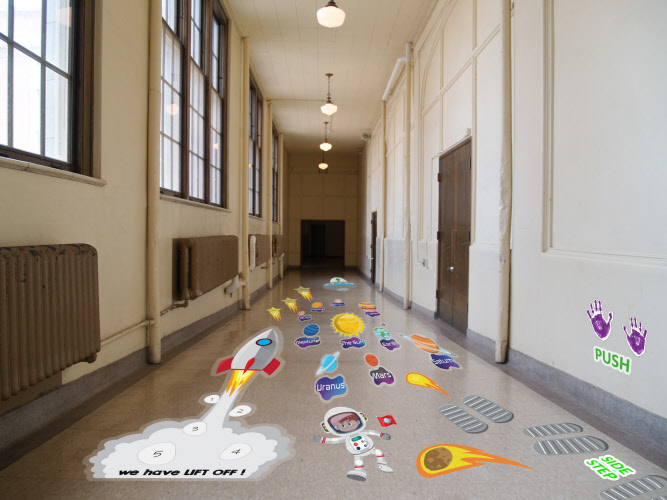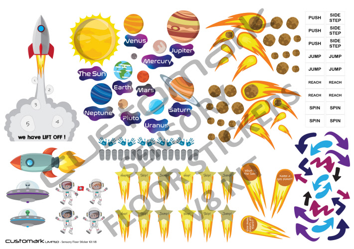 • Supplied as standard with the following sensory elements – 1 x countdown rocket, 1 x solar system planets kit, 1 x explorer rocket, 2 x UFO’s, 4 x astronauts, 12 x hop, skip& jump shooting stars, 3 x space question comets, 8 x pairs of moon boot prints, 5 x pairs of hands, 2 x asteroids and comet kits, 2 x colourful arrow kits and 18 x message prompts. (See diagram images for more info*)